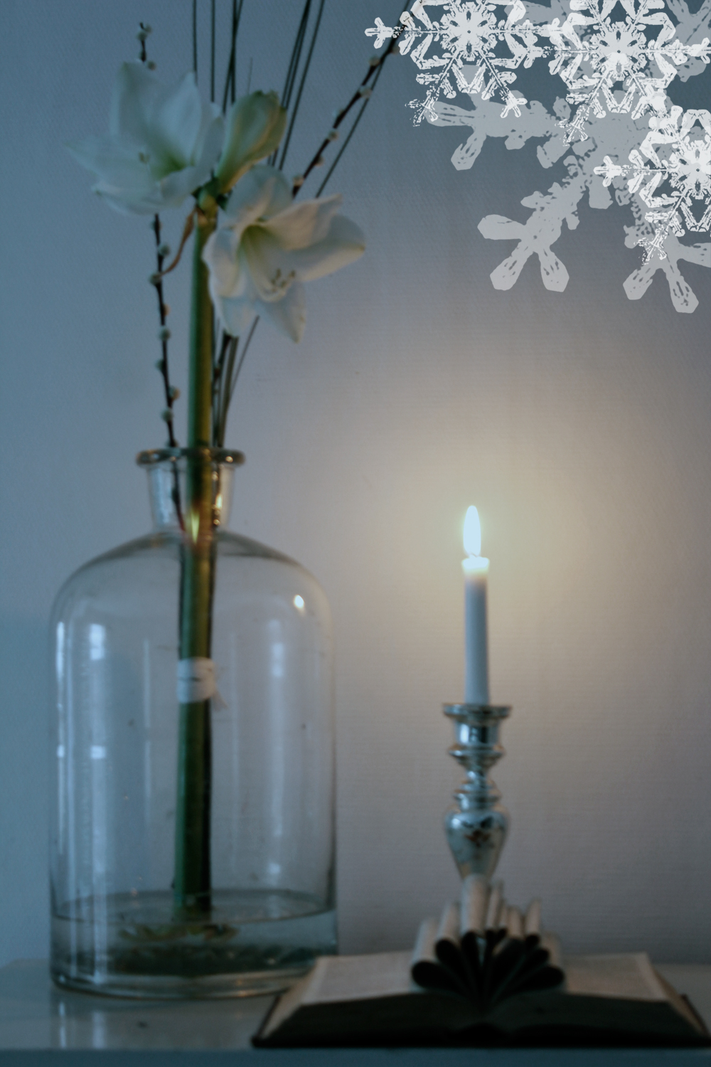 | På den lilla hyllan som går runt hela rummet, har jag lagt lite lärkkvisar och placerat ljus i små glasflaskor. Tyvärr fick jag inte till ljusen när jag fotade. |