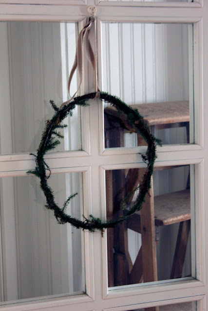 | Duken är en jutesäck och kransarna är gjorda av lärkträ. Ljusslingan kommer från Granit och lyser upp hela verandan, måste fixa en dimmer till den. |
