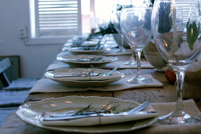 | Lite mys på bordet, väldigt enkel dekoration med granris och rödlök. Ljusstakarna är gamla trattar och lyser så fint |
