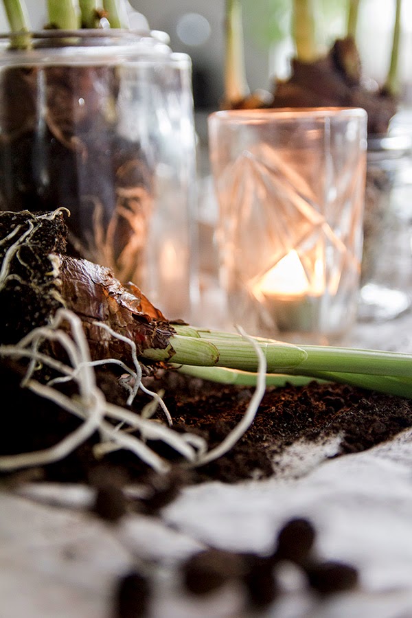 | De första hyacinterna har funnit sin plats i vårt vardagsrum. |